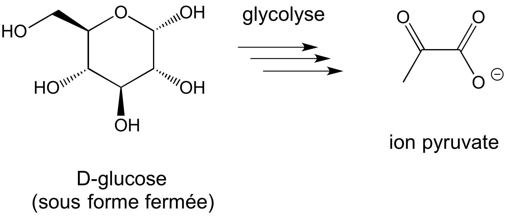 Elles se nourrissent des sucres comme source de carbone et d’énergie pour leur croissance et leur multiplication. Elles rejettent lors de ce processus d’autres molécules organiques ou inorganiques plus simples : on appelle ce phénomène la fermentation. Celle-ci doit se dérouler dans un milieu dépourvu de dioxygène. En effet, la levure est capable de respiration aérobie en présence du dioxygène de l’air, ce qui entraîne une oxydation totale des sucres pour former du dioxyde de carbone (CO2) et de l’eau (H2O). Ce phénomène est similaire à la respiration des animaux et ne produit pas d’alcool. La fermentation alcoolique est donc un processus anaérobie. Tout d’abord, une série de réactions enzymatiques, appelée glycolyse, transforme une molécule de D-glucose en deux ions pyruvate (Figure 2).