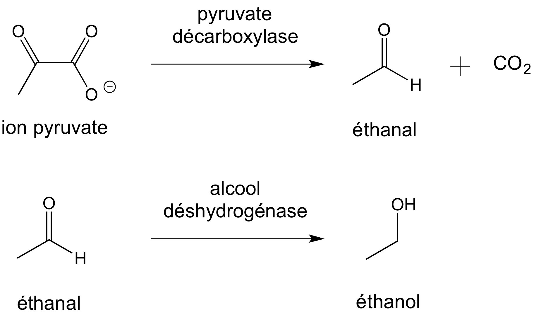 Celui-ci est ensuite transformé par une enzyme (la pyruvate décarboxylase) en éthanal et en dioxyde de carbone CO2 (Figure 3). L’éthanal est ensuite réduit en éthanol par l’enzyme alcool déshydrogénase.