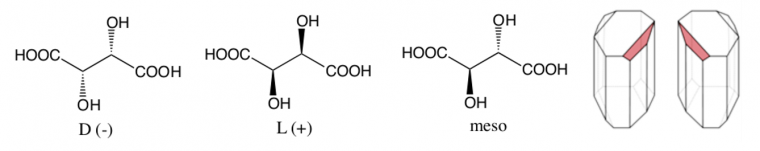 La vigne est la seule plante à produire des quantités non négligeables d’acide tartrique, mais il est également présent à l’état de trace dans l’ananas, le concombre ou la pomme de terre. Le terme tartrique dérive du latin tartarum qui signifie « dépôt ». C’est une molécule chirale, et le raisin contient le stéréoisomère L+ tartrique. C’est d’ailleurs Pasteur qui commença sa carrière de chercheur en séparant sous microscope des cristaux de tartrate gauche L+ et droit D- (Figure 9).