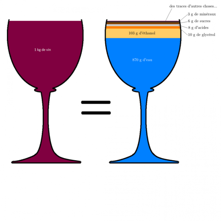 Ainsi, le vin est un mélange complexe, contenant un très grand nombre de molécules différentes. On pourra retenir les trois grandes catégories (alcools, sucres et acides) qui, en fonction de leurs proportions relatives, et additionnées aux espèces plus minoritaires et à la large palette d’arômes susceptibles de se développer lors de la vinification, offrent la diversité des vins que nous connaissons : du vin rouge tannique au vin blanc sec, en passant par le sauternes ou le porto…