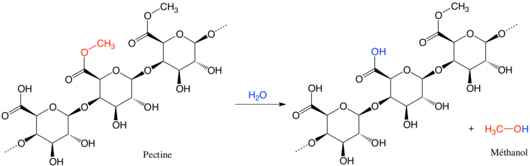 Le méthanol est un alcool très toxique dont la consommation peut entraîner la cécité, voire la mort. La dose mortelle de méthanol pur est évaluée à 100 mL, soit environ 79 g. Le vin en contient en faible quantité, entre 100 et 300 mg/L : il faudrait donc ingurgiter 790 L de vin pour s’intoxiquer au méthanol (en ayant survécu au coma éthylique)… Sa production lors de la vinification suit un tout autre processus que celle de l’éthanol. Les fruits comme le raisin, et en particulier leurs pépins, contiennent des molécules complexes : les pectines. Ces macro-molécules sont composées d’un assemblage de molécules de sucre ayant une fonction alcool oxydée en acide carboxylique. De plus, 40 à 60 % de ces acides se présentent naturellement sous forme d’ester méthylique. Lors de la vinification, des enzymes issues du raisin et des levures, les pectine méthylestérases, hydrolysent les fonctions ester pour former des fonctions acides carboxyliques qui restent attachées à la chaîne pectinique, et du méthanol (Figure 5).