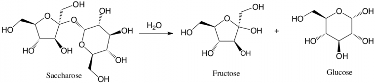Le saccharose (ou sucrose) est une molécule composée de deux sucres élémentaires : une molécule de glucose liée à une molécule de fructose (Figure 6). Il est formé dans les feuilles de la vigne lors de la photosynthèse pour stocker les atomes de carbone fournis par le CO2 atmosphérique et l’énergie apportée par le rayonnement solaire. La molécule de saccharose est ensuite hydrolysée : les deux molécules de sucre qui la composent sont séparées et transportées par la sève jusqu’aux fruits. Contrairement au saccharose, ces deux sucres, une fois isolés, peuvent être consommés par les levures : ils sont dits fermentescibles.