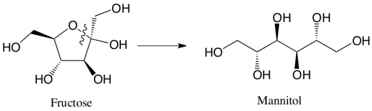 Le glucose est converti plus rapidement en éthanol car la plupart des levures de vinification sont davantage glucophiles que fructophiles, c’est-à-dire que leurs membranes cellulaires présentent une perméabilité supérieure pour le glucose que pour le fructose. Ainsi les sucres restants en fin de vinification sont composés principalement de fructose. Celui-ci, peut également être converti en mannitol (Figure 7) par fermentation mannitique lorsque des bactéries se développent dans la cuve si la température de vinification dépasse une valeur limite (30 à 35°C), mais ce processus n’est pas désiré. C’est la raison pour laquelle la température des cuves doit-être contrôlée lors de la fermentation.