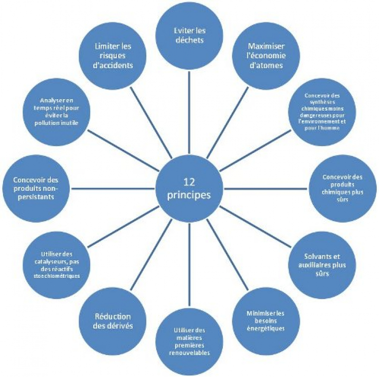 La chimie verte s’articule autour de douze principes, énoncés par Anastas et Warner [1], pères de la chimie verte (Figure 1). Ils reposent sur l’aspect environnemental et économique ainsi que sur la sécurité :