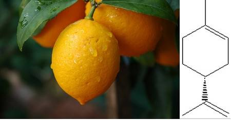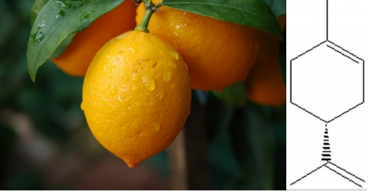 Le limonène est un terpène cyclique chiral ; l’énantiomère dextrogyre, le D-limonène est extrait de la peau du citron. Largement utilisé comme fragrance et comme agent de nettoyage, il est classé comme un Composé Organique Volatil (COV) mais ne contribue pas à la destruction de la couche d’ozone, à cause de son oxydation rapide par CO2 et H2O.
