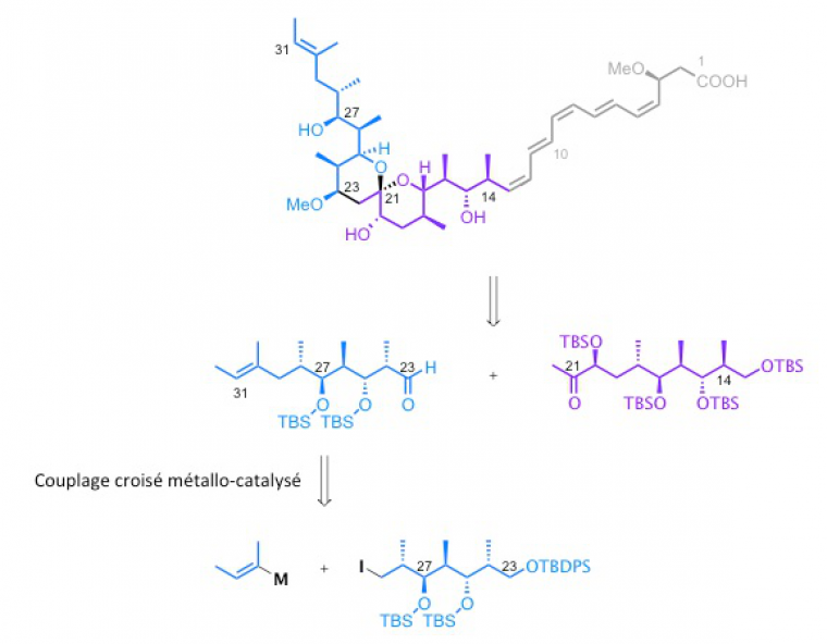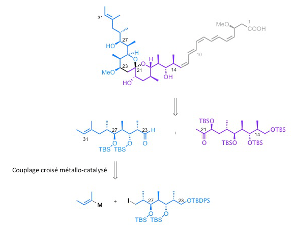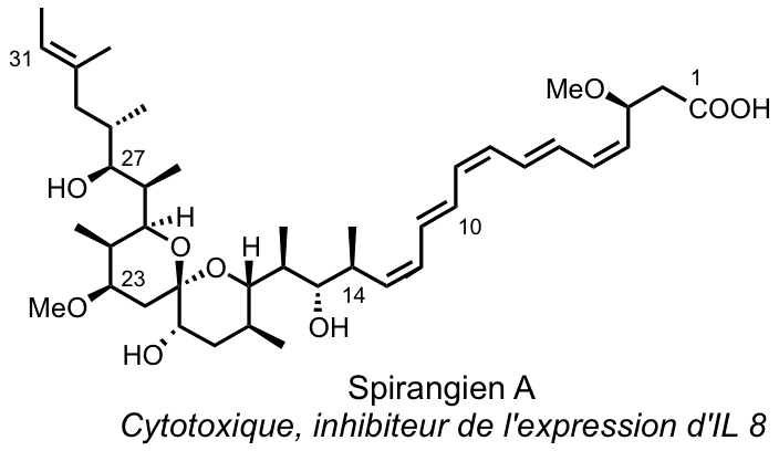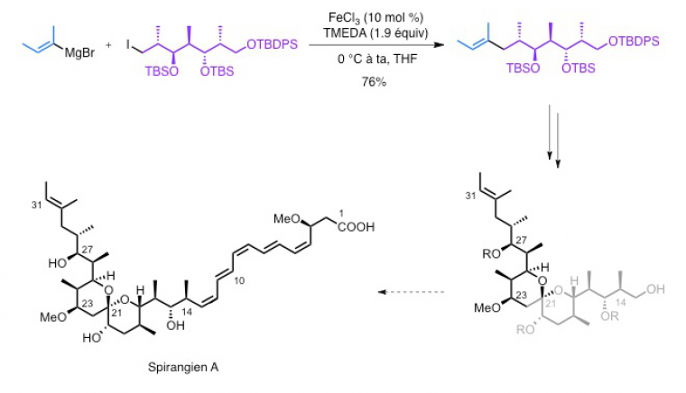 Cette méthodologie a ensuite été appliquée à la synthèse du spirangien A : l’étape de couplage croisé métallo-catalysé s’est déroulée avec un bon rendement (76 %). D’autres étapes, non détaillées ici, ont ensuite conduit au spirangien A.