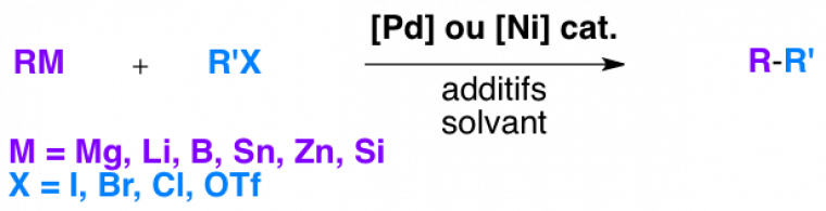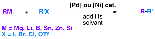 Les couplages croisés métallo-catalysés, développés dans les années 1980, sont des réactions incontournables de la chimie organométallique, mettant en jeu la création d’une liaison C-C et l’utilisation d’un catalyseur à base de palladium ou de nickel. On peut les schématiser par le bilan suivant: