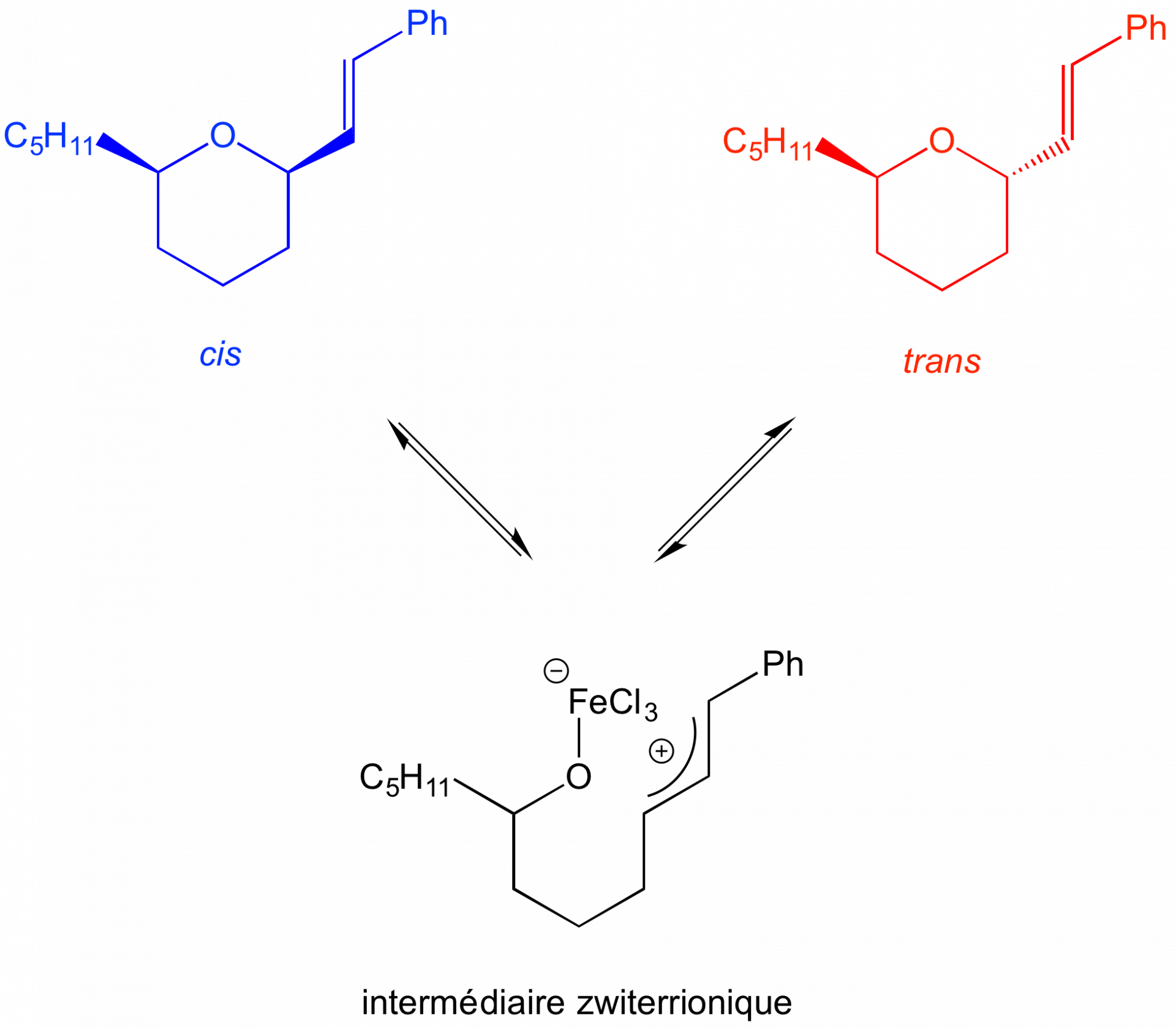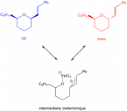 Le mécanisme met bien sûr en jeu l’acidité de Lewis du chlorure de fer (III) et passe par un intermédiaire zwiterrionique. L'équilibre chimique qui existe entre les composés cis, trans et l'intermédiaire zwiterrionique permet l'obtention, au bout d'un temps suffisamment long, du composé le plus stable, à savoir le composé cis.