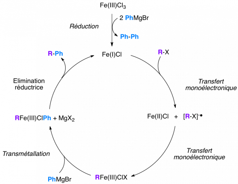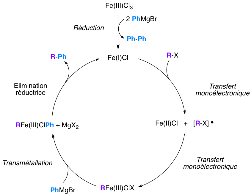 Les couplages utilisant du fer ont été étudiés dès les années 1970. L’équipe de Kochi s’était par exemple intéressée aux couplages entre un organomagnésien et un halogénure de vinyle, catalysés par des complexes de fer. Les rendements de ces réactions étant faibles par rapport à ceux des couplages utilisant du palladium et du nickel, les travaux de recherche dans ce domaine ont été laissés à l’abandon jusqu’à la fin des années 1990.