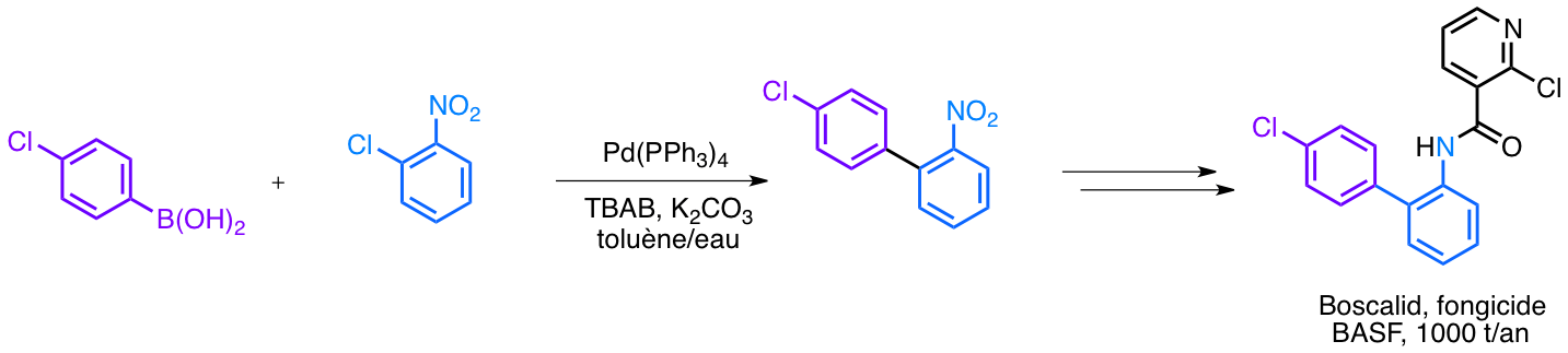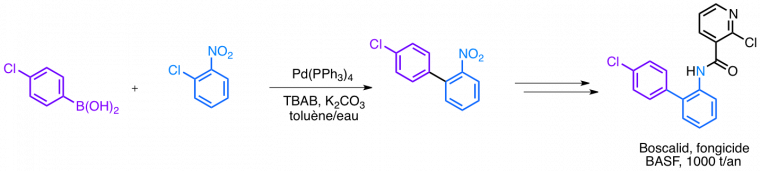 Ils sont notamment utilisés dans l’industrie chimique : par exemple, la synthèse du fongicide appelé BOSCALID, commercialisé par BASF, utilise l’un de ces couplages.