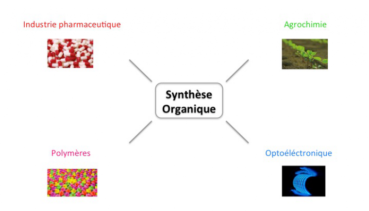 La synthèse organique est un élément « charnière » de la chimie car elle fournit des composés pour l’industrie pharmaceutique, l’optoélectronique, l’industrie des plastiques ou encore l’agriculture.