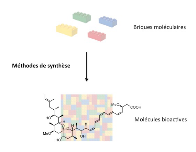 On peut décrire de façon imagée la synthèse d’une molécule comme l’agencement des groupes d’atomes les uns avec les autres, à la manière d’un jeu de construction type Lego® dans lequel il s’agit d’empiler des briques. La stratégie de synthèse consiste à déterminer les réactions qui permettent de lier les différentes « briques » les unes aux autres et l’ordre dans lequel réaliser ces réactions.
