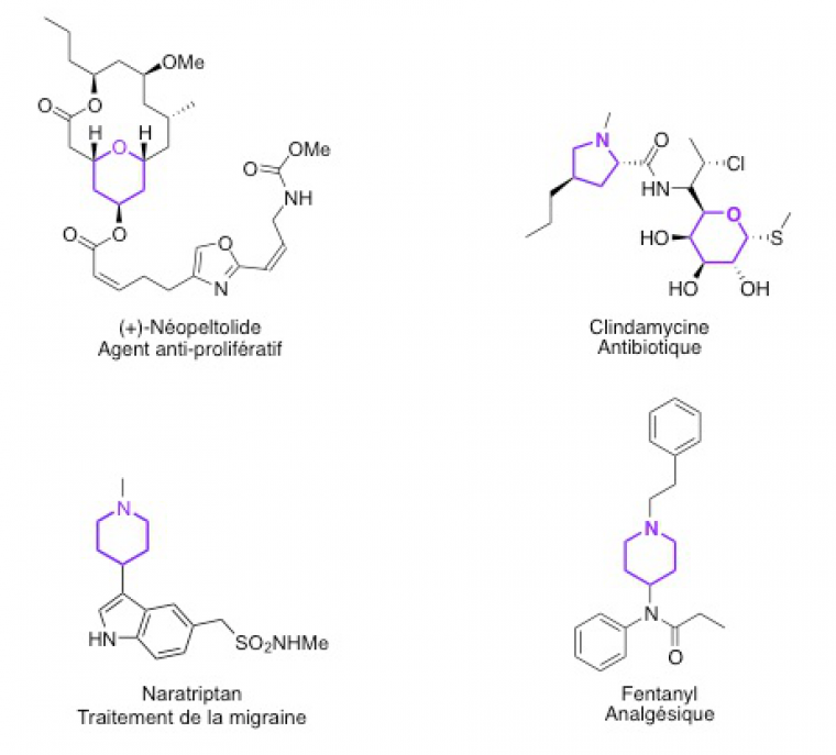 Les hétérocycles sont des composés comportant un cycle mettant en jeu au moins deux éléments différents, généralement l'élément carbone et un autre élément tel que l'oxygène, l'azote etc, qualifié d'hétéroélément. Ces hétérocycles sont très présents en chimie médicinale : on les rencontre dans un certain nombre de principes actifs.