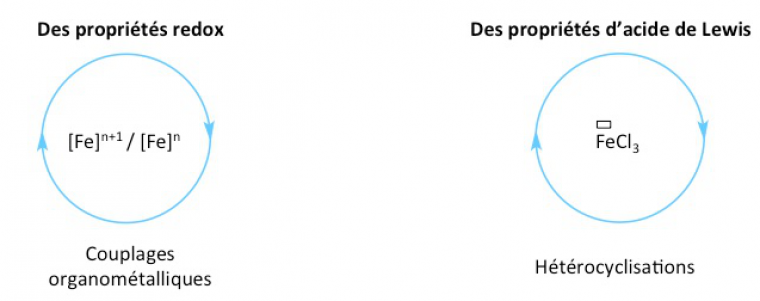L’élément fer est impliquées dans de nombreux types de réaction; cet article propose d'illustrer des réactions catalysées par le fer utilisant ses propriétés d’oxydoréduction (couplages organométalliques) et d'autres utilisant son acidité de Lewis (hétérocyclisations).