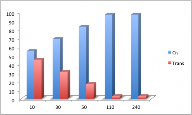 On observe donc qu’en plaçant la réaction sous contrôle thermodynamique (durée de réaction suffisamment longue), le composé cis, plus stable que le composé trans, est obtenu majoritairement.