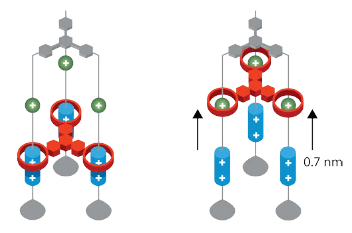 Durant la deuxième moitié des années 1990, les développements se poursuivent ; en 2000, Jean-Pierre Sauvage met au point un assemblage de deux rotaxanes entrelacés dans lequel il peut contrôler un mouvement de contraction/extension d’amplitude voisine de 2 nm. Il reproduit alors, à l’échelle moléculaire, le mouvement des fibres musculaires (Figure 10).