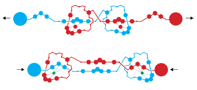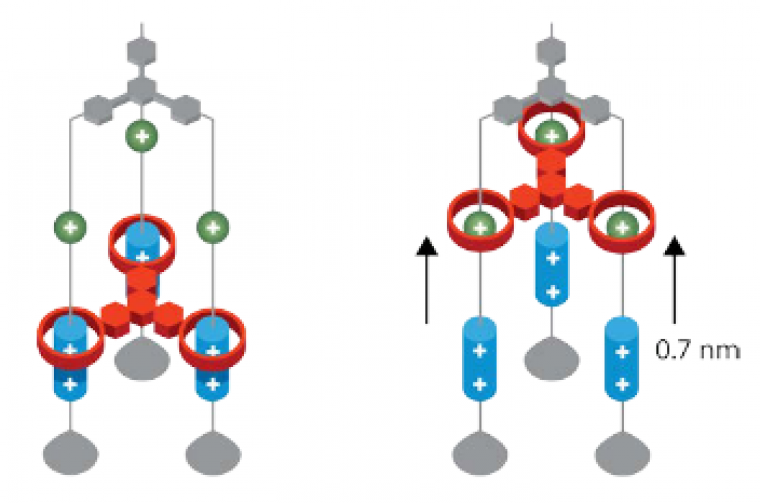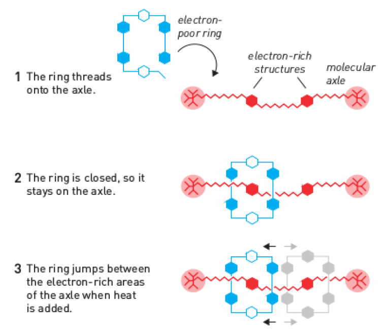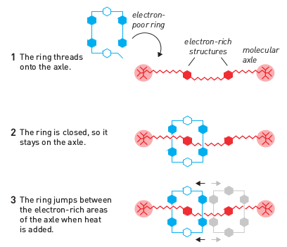Au départ, l’anneau moléculaire (en bleu ci-dessus) est ouvert. C’est une structure pauvre en électrons, qui interagit favorablement avec les noyaux riches en électrons de l’axe moléculaire (en rouge ci-dessus). L’anneau est enfilé sur l’axe, puis fermé. L’axe comporte à ses extrémités des groupements volumineux qui empêchent l’anneau de s’échapper. L’anneau moléculaire peut adopter deux positions sur cet axe : celles correspondant aux deux cycles riches en électrons. On observe donc un mouvement de translation de l’anneau le long de l’axe (Figure 7).