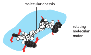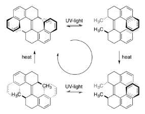 En 1999, les travaux de Bernard L. Feringa (de l'Université de Groningen, Pays-Bas) sur ce sujet aboutissent au premier dispositif moléculaire pouvant tourner sur lui-même, toujours dans le même sens, grâce à des cycles alternant irradiation UV et relaxation thermique. Le premier moteur moléculaire est né !