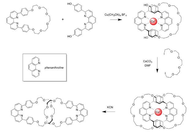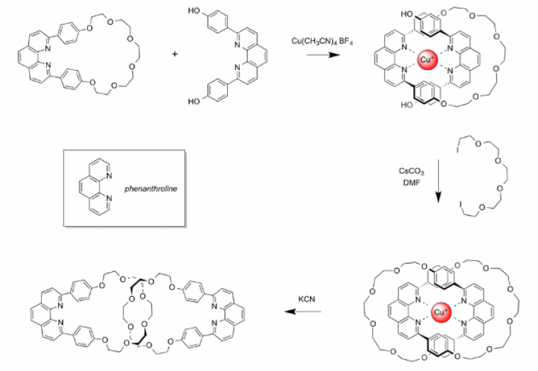 Les rendements sont faibles (quelques %). Les recherches se poursuivent dans les années 1970 mais c’est en 1983 qu’une avancée majeure a lieu. En effet, cette année-là, Jean-Pierre Sauvage et son équipe de recherche du CNRS, basée à l’Université de Strasbourg, mettent au point un procédé de synthèse utilisant la chimie organométallique et plus précisément la coordination entre un ion cuivre (I) et des entités phénanthroline, dont le rendement est bien meilleur (42 %).
