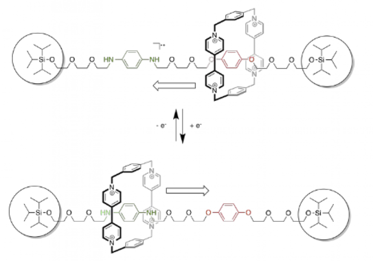 L’enjeu est alors de contrôler ce mouvement. En 1994, Stoddart y parvient, via un cycle d’oxydation/réduction : il utilise le même type de structure que précédemment à ceci près que les deux noyaux électrodonneurs de l’axe moléculaire sont différents :