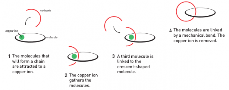 Il y a d’abord coordination avec l’ion cuivre (I) d’une molécule en forme d’anneau (en noir ci-dessus) et d’une molécule en forme de croissant (en rouge ci-dessus). Ensuite, une troisième entité est liée de façon covalente à la molécule en forme de croissant et le deuxième anneau est créé. Enfin, une dernière réaction permet d’éliminer l’ion cuivre (I) et d’obtenir un assemblage de deux anneaux moléculaires, entrelacés l’un dans l’autre sans pour autant être lié de façon covalente.