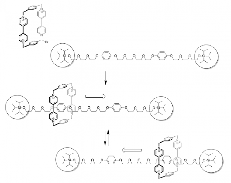 En 1991, Stoddart met au point un assemblage de type rotaxane, dans lequel l’anneau peut se déplacer le long de l’axe. Le principe est le suivant :