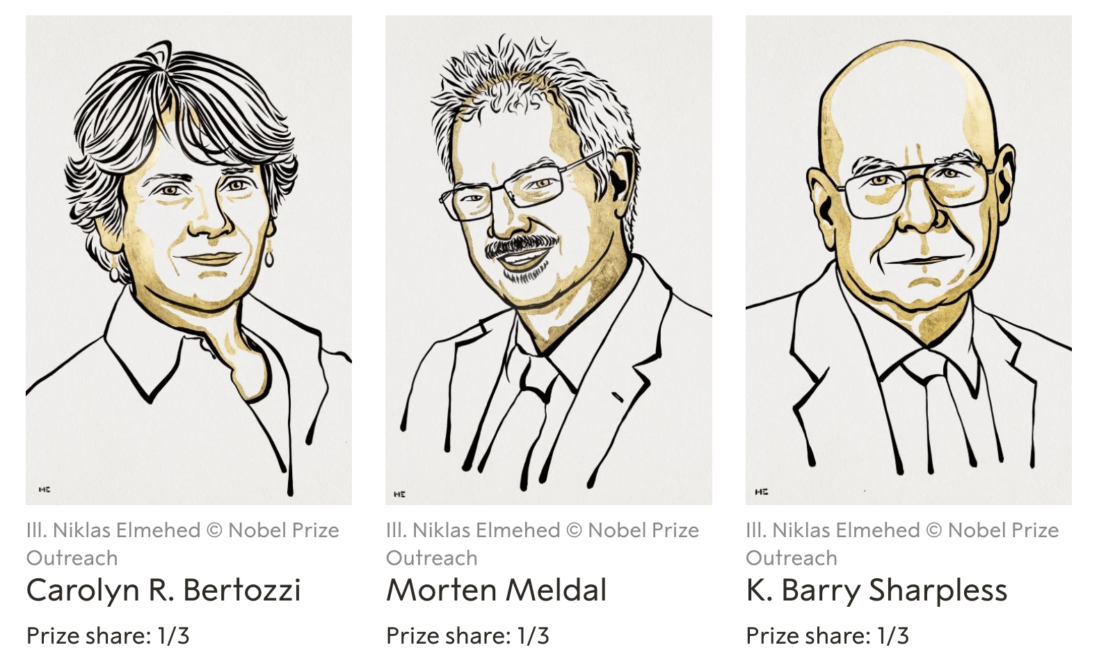 L’Académie royale des sciences de Suède a décerné le Prix Nobel de Chimie 2022 à Barry Sharpless (Scripps Research, La Jolla, CA, USA) , Morten Meldal (University of Copenhagen, Denmark) et Carolyn Bertozzi (Stanford University, CA, USA).