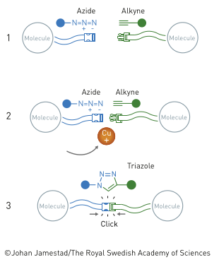 Les azides et les alkynes réagissent très efficacement lorsque des ions cuivre sont ajoutés. Cette réaction est actuellement beaucoup utilisée afin de lier facilement deux molécules ensemble.