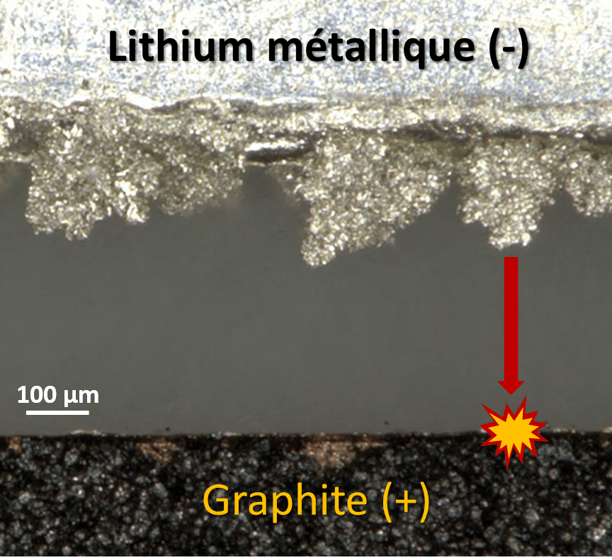 Lors des cycles répétés de charge et décharge, du lithium métallique peut être électrodéposé et accumulé sous forme de dendrites à l’électrode négative (ici, sur le lithium en configuration demi-cellule). Ces dendrites, qui peuvent créer un court-circuit entre les deux électrodes négatives et positives, sont responsables de l’emballement thermique des batteries.
