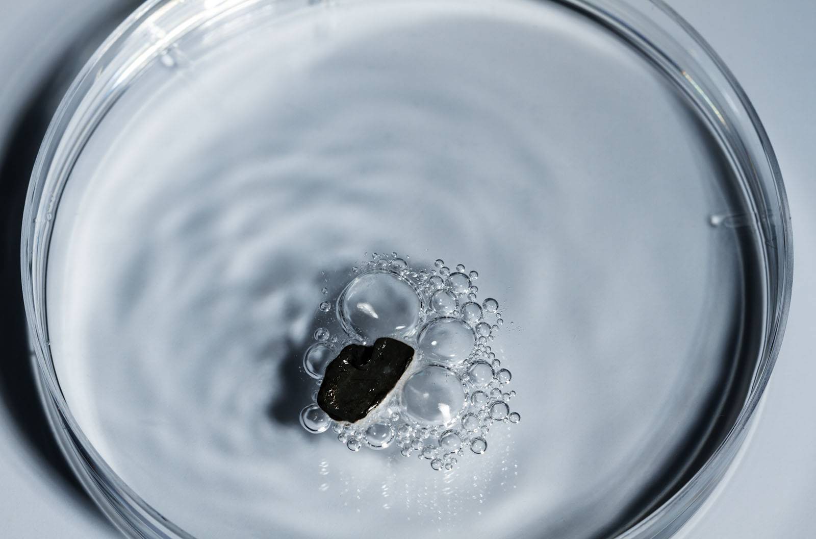 Un morceau de lithium métallique est placé dans une boîte de Petri remplie d'eau. On observe la formation de bulles de dihydrogène selon la réaction d'équation : Li(s) + H2O(l) → Li+(aq) + OH-(aq) + 1/2 H2(g).
