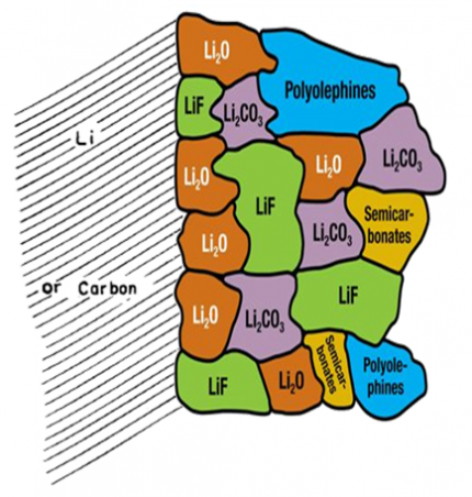 Cette couche organique/inorganique bloque le transfert d’électron à l’électrolyte mais permet la diffusion du lithium vers l’électrode.