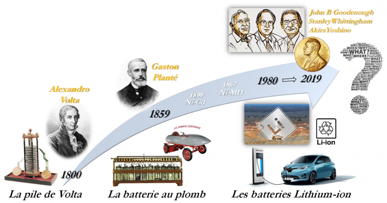 Depuis l’invention de la pile de Volta (0,8-1,1 V) en 1800, empilant par alternance des disques métalliques (étain, zinc et cuivre ou argent) séparés par des couches de papier ou par des rondelles de cuir imprégnées de saumure (électrolyte) et les découvertes successives de :