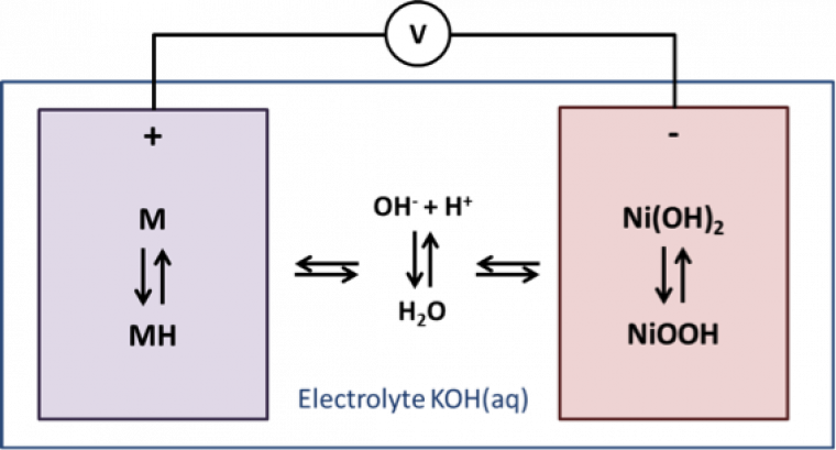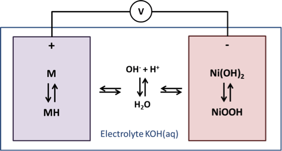 En 1988, la batterie Nickel-Métal Hydrure (Ni-MH), toujours dérivée de la batterie Ni-Cd, pose les bases des batteries Li-ion actuelles en étant constituée de deux électrodes d’insertions. En effet, jusqu’à l’invention de cette batterie il y avait toujours « consommation » d’une des électrodes au cours du fonctionnement de la batterie (par exemple consommation de l’anode en cadmium dans une batterie Ni-Cd, lors de la décharge). La cathode reste la même par rapport aux modèles Ni-Cd, en revanche l’anode est maintenant composée d’un alliage M ayant la capacité d’absorber et de désorber l’hydrogène. Cet alliage est généralement un intermétallique de type LaNi5 ou de type TiNi (Figure 4).
