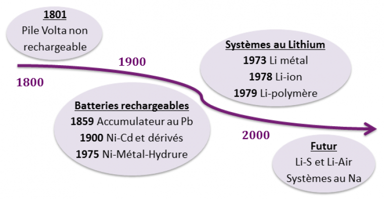 Les premiers systèmes électrochimiques sont les piles ou systèmes primaires non rechargeables tel que la pile Volta, créée en 1801. Il existe aujourd’hui une grande diversité de piles. Dans la suite de cet article, nous allons nous focaliser sur les systèmes rechargeables uniquement (Figure 2).