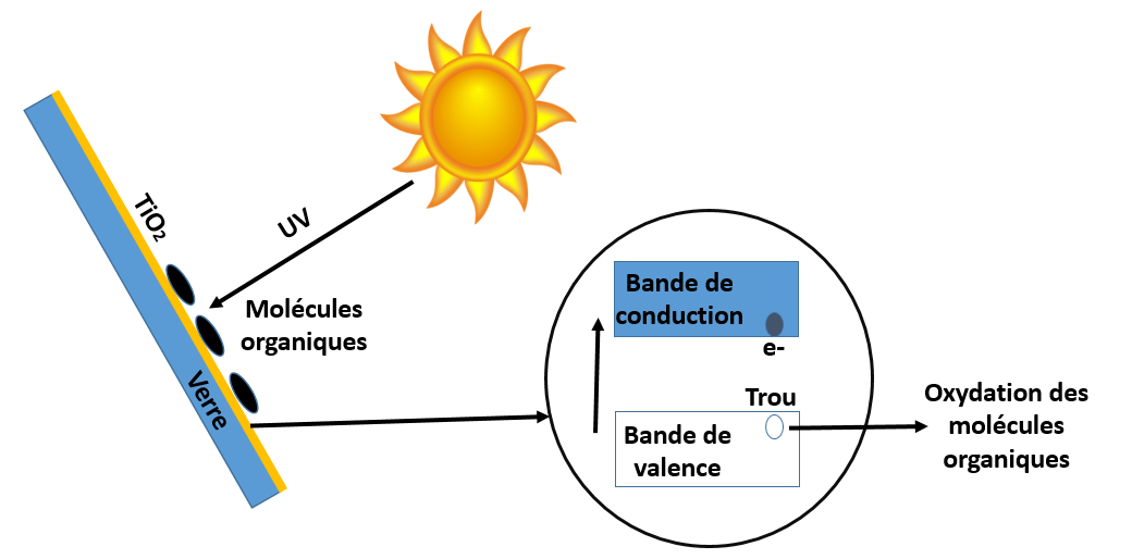 Après la photo-activation du dioxyde de titane par les rayonnements UV du soleil conduit à la formation des paires électron/trou mentionnées précédemment TiO2 → TiO2 (h+BV + e−BC)