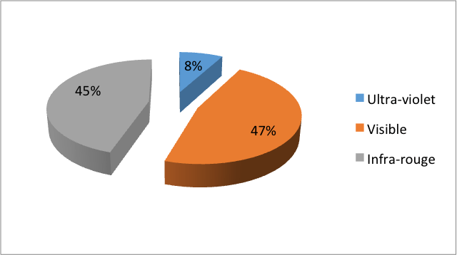 On remarque en effet la présence d’un maximum de radiation solaire aux alentours de 500 nm et le fait qu’une partie importante du spectre solaire est composée de lumière visible. Les pourcentages des domaines composant le spectre solaire sont présentés dans la Figure 6. Ceci explique la limitation de l’utilisation du TiO2 dans le domaine des cellules solaires parce qu’il est efficace essentiellement dans le domaine des UV, minoritaire dans le spectre solaire.