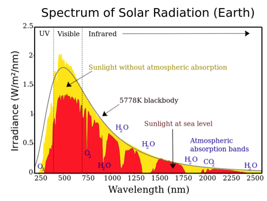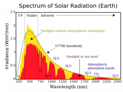 L’obtention des propriétés photo-catalytiques du dioxyde de titane nécessite de travailler dans le proche UV (UV-A, 300 nm < λ < 400 nm), du fait d’une bande interdite de 3,2 eV. Or les UV constituent une faible partie du spectre solaire (Figure 5).
