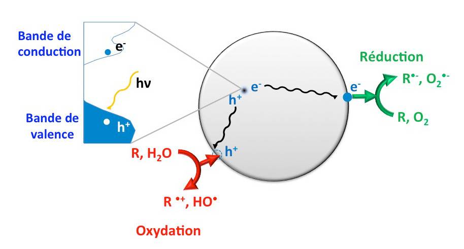 Un semi-conducteur photo-activé doit absorber un rayonnement d’énergie au moins équivalente à sa bande interdite afin de provoquer le passage d’un électron de la bande de valence vers la bande de conduction. Cela entraîne la formation d’un trou à la place de l’électron dans la bande de valence : une paire électron/trou est créée. Ces porteurs de charge peuvent se déplacer au sein du semi-conducteur et participer à une réaction chimique. Ils peuvent aussi se recombiner : plus la recombinaison est tardive, plus la paire électron/trou a une durée de vie longue et plus le semi-conducteur est actif.