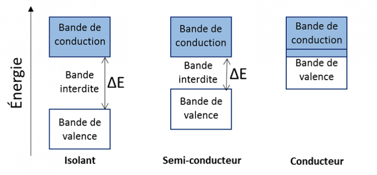 Les électrons se trouvent initialement dans la bande de valence et la capacité conductrice du matériau est conditionnée par la facilité de transit de ces électrons vers la bande de conduction (Figure 2). Pour les conducteurs, la bande de conduction et la bande de valence se chevauchent : les électrons transitent instantanément entre les deux bandes et peuvent circuler dans le solide : la conductivité est bonne. Plus la bande interdite est large, plus le matériau acquiert un caractère isolant (bande interdite de l’ordre de 5 - 6 eV). Dans le cas d’un semi-conducteur, la bande interdite est plus faible que celle d’un isolant (entre 0,5 et 4 eV) : considéré isolant au départ, il peut devenir conducteur si une énergie suffisante est apportée (sous forme de chaleur, de rayonnement…) pour faire passer des électrons de la bande de valence à la bande de conduction.