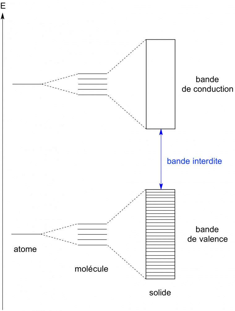 On observe des niveaux discrets d’énergie au sein d’un atome ou d’une molécule; au sein du solide, les niveaux d’énergie sont très proches, ce qui conduit à l’apparition de bandes d’énergie: une bande de valence (niveaux remplis d’électrons) et une bande de conduction (niveaux vides à 0 K).