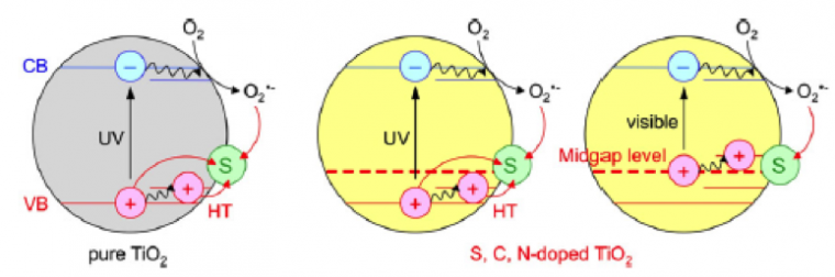 Pour améliorer l’efficacité du dioxyde de titane en photocatalyse, plusieurs méthodes ont été mises au point. Parmi celles-ci, la technique la plus connue est le « dopage ». Un matériau est dopé lorsqu’un élément étranger est introduit au sein de sa maille.