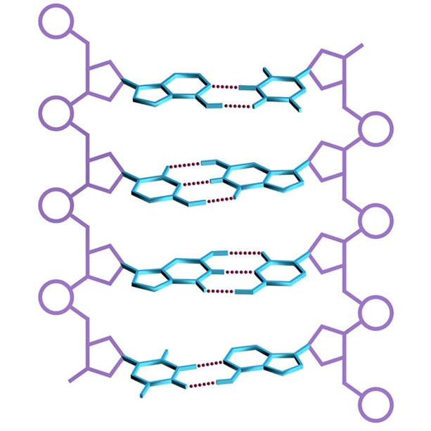 Les entités sucre-phosphate sont représentées en violet, les bases thymine, adénine, guanine, cytosine en bleu et les liaisons hydrogène assurant la formation des paires de bases sont représentées en pointillés rouges.