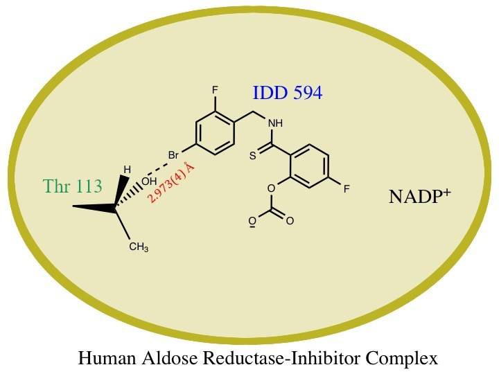 La liaison halogène est également responsable de l’inhibition de l’enzyme aldose réductase humaine en milieu biologique. [18b] Cette enzyme est impliquée dans la réduction des aldéhydes, des aldoses et des corticostéroïdes et met en jeu le couple NADP+/NADPH. La structure à l’état solide du complexe aldose réductase humaine-inhibiteur (IDD594), obtenue par diffraction des rayons X, montre la formation d’une liaison halogène entre l’atome de brome de l’inhibiteur et l’atome d’oxygène du résidu Thréonine 113 de l’enzyme (Figure 9).