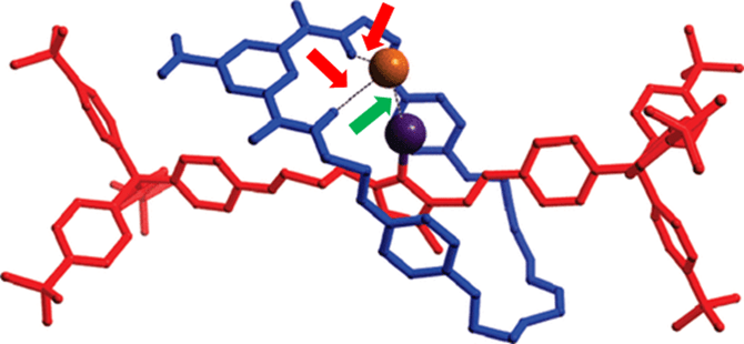 La liaison halogène est également utilisée en reconnaissance moléculaire des anions. Dans cet exemple, Beer et coll. s’intéressent à la reconnaissance moléculaire d’un anion chlorure à l’aide d’un rotaxane1 en combinant une liaison halogène C-Br…Cl- avec des liaisons hydrogène N-H…Cl-.