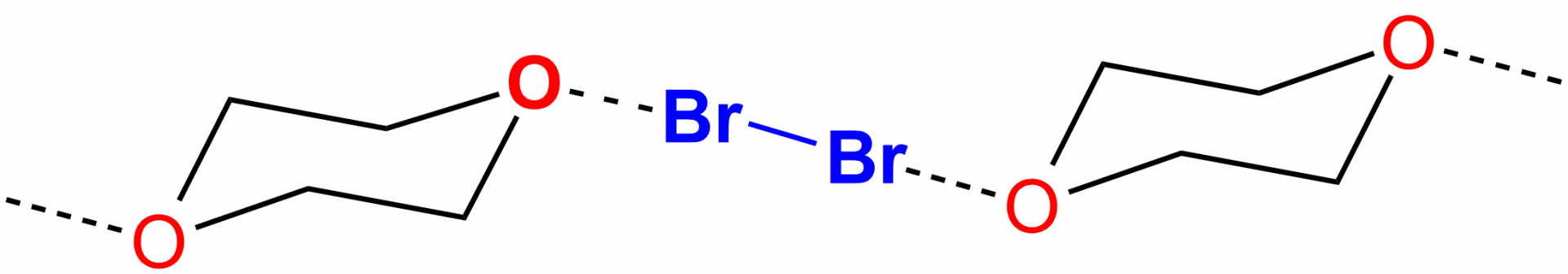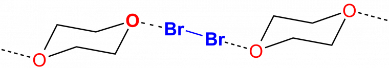 Les halogènes sont les éléments de la 17e colonne du tableau périodique : le fluor (F), le chlore (Cl), le brome (Br), l’iode (I), et de manière plus anecdotique, l’astate (At) et le tennesse (Ts). Au début du 19e siècle, un article proposé par J.J. Colin fait mention de complexes colorés entre une molécule de diiode (I2) et différentes substances contenant de l’ammoniaque (NH3). [14a]Par analogie avec la liaison hydrogène, la liaison halogène prend réellement son essor à partir des années 1950. Ainsi, en 1954, Hassel et coll. utilisent la diffraction aux rayons X pour résoudre la structure à l’état solide du complexe formé entre le 1,4-dioxane et le dibrome (Figure 6). [14b]