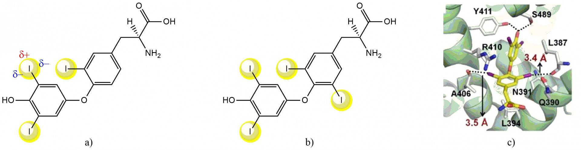 La présence et l’importance des liaisons halogènes dans les systèmes biologiques n'ont été mises en évidence que très récemment, car elles sont rares. Ainsi, on peut noter par exemple le rôle de ces interactions dans les hormones thyroïdiennes T3 (3,5,3’-triiodothyronine) et T4 (thyroxine, 3,5,3’,5’-tétraiodothyronine), contenant respectivement 3 et 4 atomes d’iode (Figures 8a et 8b). [17] Ainsi, les quatre atomes d’iode de l’hormone T4 (en jaune) peuvent interagir avec quatre sites récepteurs de la sérum-albumine humaine. [18a] L’hormone T4 est ainsi véhiculée dans l’organisme afin d’être convertie en T3, hormone régulant la majorité des processus physiologiques de l’organisme tels que la croissance biologique ou la température corporelle.