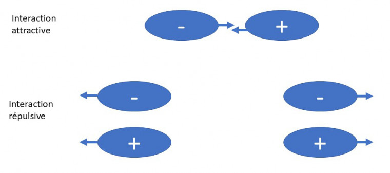 Une interaction électrostatique est une interaction s’établissant entre deux corps chargés (atomes ou molécules). Elle peut être attractive (- +) ou répulsive (-- ou ++, voir Figure 1).