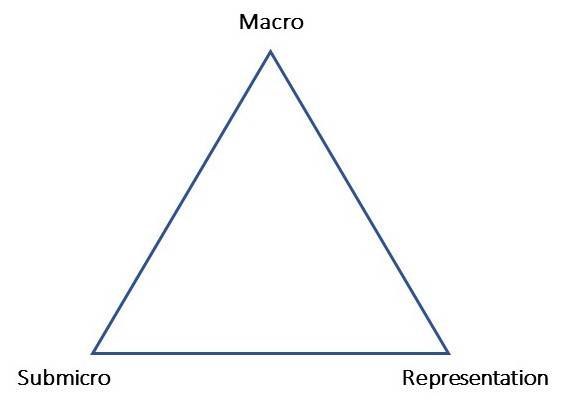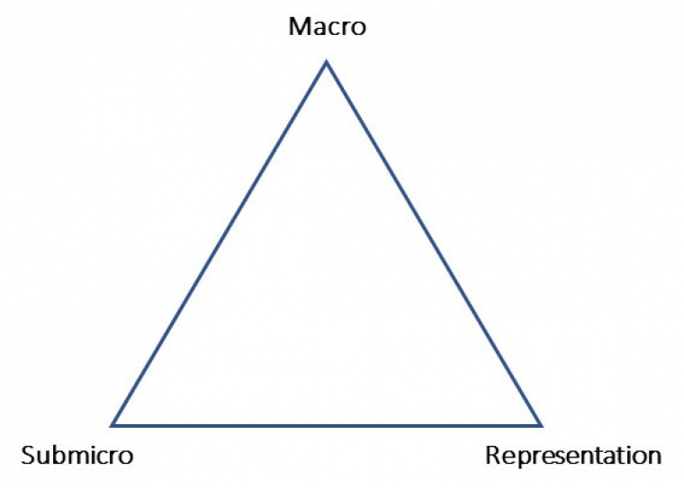 En didactique de la chimie, Johnstone (1993), en adoptant une approche qui se réfère à la psychologie cognitive, a été l’un des premiers à s’intéresser aux difficultés rencontrées par les étudiants en chimie face à un enseignant se déplaçant constamment entre le registre symbolique, les faits expérimentaux et leur interprétation en termes d'entités submicroscopiques. Ces trois aspects du savoir en chimie ont été portés aux sommets d’un triangle (Figure 1), dont Talanquer (2011) a souligné le rôle heuristique pour la recherche en didactique et l’enseignement durant les vingt-cinq dernières années. Les sommets « Macro » et « Submicro1 » (Figure 1) ne sont pas associés aux modèles mais à l’échelle du monde dans laquelle on se situe pour décrire le monde.