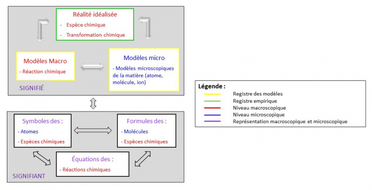 L’espèce chimique possède deux niveaux d’interprétation essentiels dans le travail autour de la réaction chimique : un macroscopique issu des « données manipulatoires et qui se résume à la carte d'identité d'une substance » et l’autre microscopique à partir des concepts d’atomes, de molécules et d’ions (Solomonidou & Stavridou, 1994, p. 86). Le langage symbolique utilisé dans l’écriture d’une équation de réaction permet cette double interprétation. Ce système de représentation unique favorise le travail du chimiste en lui permettant de travailler simultanément dans le niveau macroscopique et le niveau microscopique. Ce qui aurait pu être considéré comme une imprécision (un même registre de représentation pour plusieurs interprétations) est en fait une richesse. Mais cela peut très vite devenir une difficulté pour les élèves.