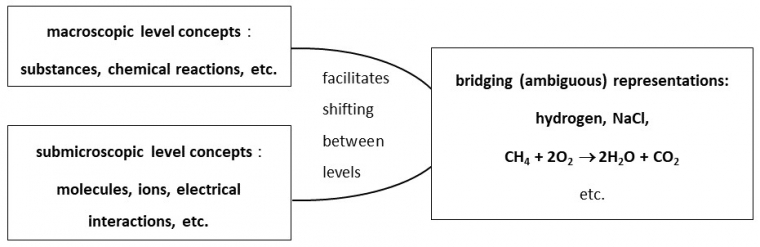 Taber (2013) considère que le domaine symbolique ne doit pas être vu comme un niveau discret des connaissances chimiques au même titre que les domaines macroscopiques et submicroscopiques. Dans le cas de la réaction chimique, il considère le langage du chimiste comme une passerelle qui facilite le déplacement entre le macroscopique (les espèces chimiques) et le submicroscopique (les entités) (Figure 2).